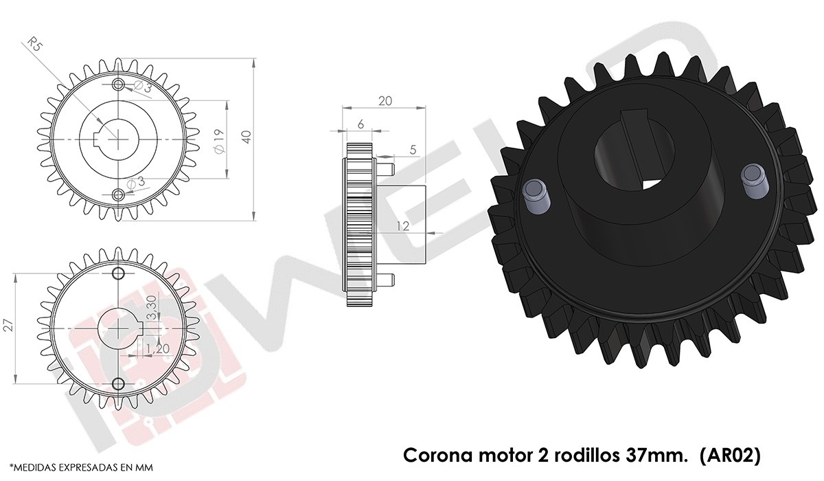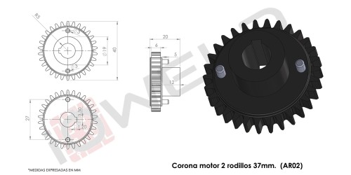 Corona dentada arrastre 2 rodillos 37mm. Con chavetero para acoplamiento directo motores 40W MTR01 , 90W MTR02 y MTR03
