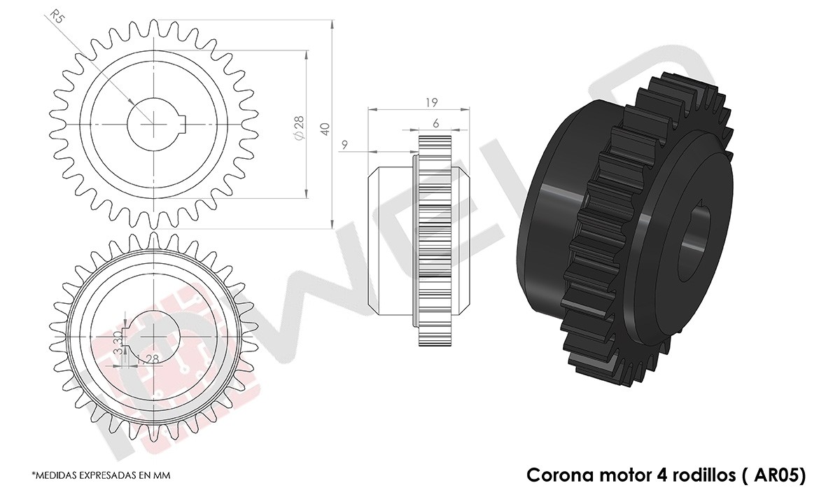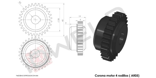 Corona dentada  con alojamiento rodillo y chavetero para acoplamiento  motores 40W MTR01 , 90W MTR02 y MTR03