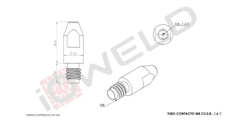 Punta de contacto Cu M8 soldadura Mig-Mag con hilo 0,8...1,6. Compatible IOW 25-36-500-PP500-RB28.